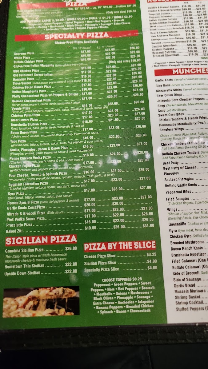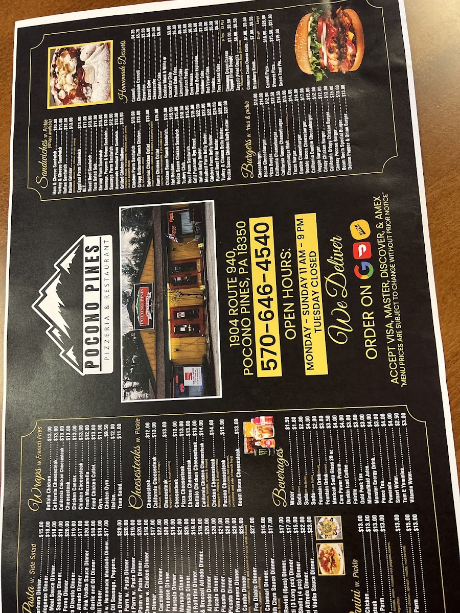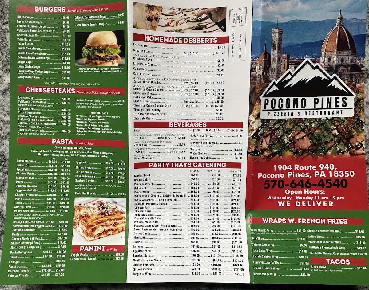 Pocono Pines Pizzeria & Restaurant offers an extensive menu with a variety of options to satisfy all cravings. Their pizza selection is extensive, featuring classics like the Plain Cheese Pizza available in Small 12", Large 16", and Sicilian sizes. For something more adventurous, there’s the Supreme Pizza in both round and Sicilian forms, as well as the delicious White Pizza. If you're craving something unique, try their Grandma Sicilian Pizza, Hometown Thin Sicilian, or the hearty Chicago Deep-Dish. You can also grab a slice of pizza, with options like Cheese Pizza Slice or Specialty Pizza Slice. For a savory snack, the Chicken & Broccoli Calzone or Pepperoni Stromboli are excellent choices, along with a variety of appetizers like Garlic Knots, Mozzarella Sticks, and Beer Onion Rings. Their hand-cut French fries are a crowd favorite, available with toppings like Cheddar Cheese Sauce or Bacon & Cheese. The salad options, such as the Caesar Salad and Antipasto Salad, provide lighter fare, while the Sausage Parm Sandwich and Homemade Meatball Parm Sandwich deliver heartier meals. For burger lovers, there’s a selection ranging from a classic Cheeseburger to a California Bacon Cheeseburger. The menu also features cheesesteaks, including the California Chicken Cheesesteak and the Cheesesteak with Peppers, Onions & Mushrooms. If you're in the mood for pasta, dishes like Pasta Marinara and Baked Ziti are perfect, with options to add Homemade Meatballs or Chicken Parm. Finish off your meal with a dessert like the rich Cheesecake or indulgent Chocolate Cake. With beverages including Soda, Vitamin Water, and Body Armor, and even party trays like Penne Vodka, Pocono Pines provides something for everyone.