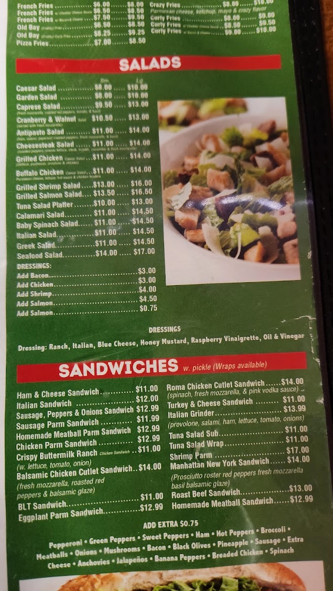 Shrimp Parm over choice of spaghetti, ziti, or penne. Available in large. Salad dressings include ranch to balsamic options.